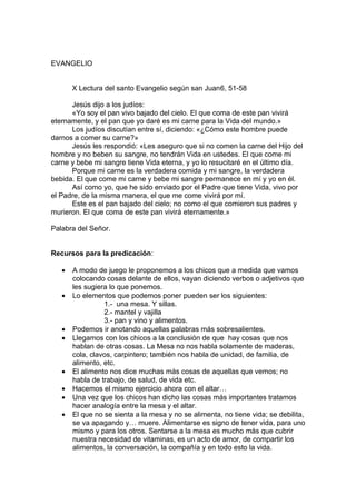 El documento habla sobre el Cuerpo y la Sangre de Cristo. Explica que al compartir el pan y la copa durante la misa, los cristianos comparten la comunión con el Cuerpo y la Sangre de Cristo. También cita a Jesús diciendo que él es el pan vivo del cielo y que aquellos que coman su carne y beban su sangre tendrán vida eterna. El documento provee recursos para una predicación enfocada en que al igual que Jesús nos alimenta, nosotros debemos alimentar a los demás.