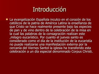 El documento describe la tradicional fiesta de Corpus Christi celebrada en Pujilí, Ecuador. Explica que durante esta fiesta se realizan bailes llamados danzantes que tienen su origen en las celebraciones de los incas. Luego describe los diferentes personajes involucrados en la organización y celebración de la fiesta, incluyendo al alcalde, prioste, danzantes, músicos, cocineros y otros.