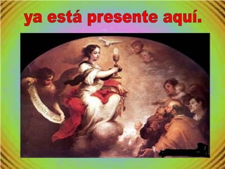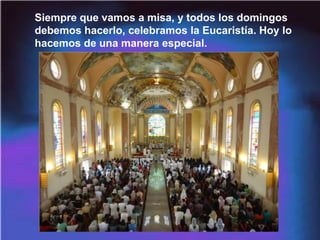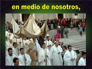 El documento describe la fiesta del Corpus Christi, en la que los católicos celebran la presencia real de Cristo en la Eucaristía. Explica que durante la misa, el pan y el vino se convierten en el cuerpo y la sangre de Cristo para ser recibidos en la comunión. También relata milagros eucarísticos como los de Lanciano y Bolsena que reafirmaron esta doctrina. El propósito de la fiesta es realzar la adoración a Cristo presente en la Eucaristía más allá de la cele