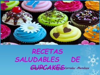 Este documento presenta 5 recetas saludables de cupcakes. Cada receta incluye una lista de ingredientes y pasos de preparación. Las recetas utilizan ingredientes como harina integral, huevos, leche, aceite de coco, queso, semillas y frutas. Los cupcakes se hornean a temperaturas entre 180°C y 210°C por 20 minutos o hasta que estén dorados.