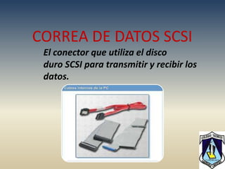 Este documento compara y resume las diferencias entre las correas de datos SCSI, IDE y SATA. La correa de datos SCSI se utiliza para transmitir datos al disco duro SCSI. La correa de datos IDE integra la electrónica para controlar los dispositivos de almacenamiento masivo y agrega unidades CD-ROM, mientras que las correas de datos SATA ofrecen mayores velocidades de transferencia de datos y cables más delgados en comparación con IDE.