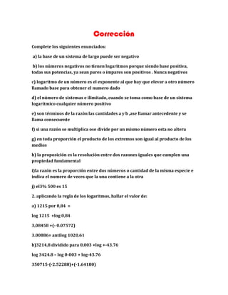 El documento contiene varias preguntas sobre conceptos matemáticos como logaritmos, proporciones y porcentajes. Se pide completar oraciones con definiciones de logaritmos, bases de sistemas de números, razones y proporciones. También se piden cálculos como hallar logaritmos usando la regla de logaritmos, escribir expresiones exponenciales en notación logarítmica, calcular porcentajes y resolver proporciones.