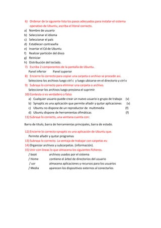 Este documento contiene 15 preguntas sobre conceptos básicos de computación e informática como ventajas de las computadoras, generaciones de computadoras, componentes de hardware, ventajas del software libre, precursor del sistema operativo Linux, distribuciones de Linux, pasos para instalar Ubuntu, componentes de la pantalla de Ubuntu, cómo copiar y eliminar archivos en Ubuntu, y características de carpetas y ficheros en Linux.