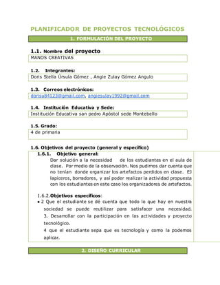 Este documento presenta un proyecto tecnológico para estudiantes de 4to grado de primaria. El proyecto busca crear organizadores para artículos de escritorio utilizando botellas plásticas recicladas. Los estudiantes aprenderán sobre tecnología, medio ambiente y trabajo colaborativo a través de actividades como cortar, pintar y decorar las botellas. El proyecto evaluará el aprendizaje de los estudiantes antes, durante y después de la actividad.