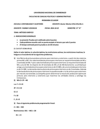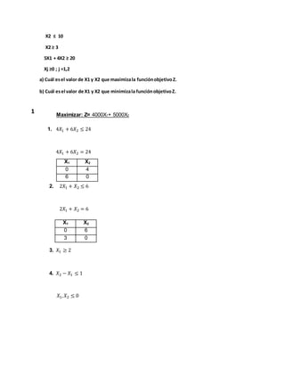 El documento presenta tres problemas de programación lineal. El primer problema involucra una fábrica de pintura que debe determinar la producción óptima de pintura interior y exterior para maximizar las utilidades, sujeto a restricciones en los insumos. El segundo problema busca minimizar una función objetivo sujeto a restricciones. El tercer problema busca maximizar y minimizar una función objetivo sujeta a restricciones. Se resuelven los tres problemas gráficamente encontrando los valores óptimos, restricciones activas e inactivas, y holguras o excedentes