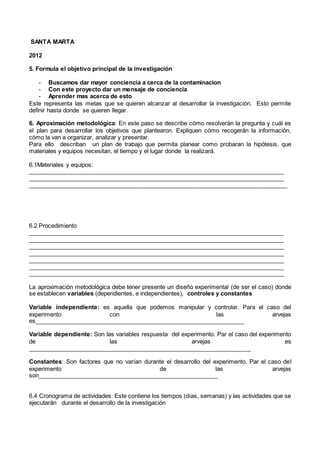 Este documento presenta los pasos de la metodología del trabajo científico que los estudiantes deben seguir para desarrollar un proyecto de investigación sobre la problemática ambiental del Río Medellín. Incluye establecer una pregunta y hipótesis de investigación, justificación, antecedentes, objetivos, aproximación metodológica, registro de observaciones, análisis de datos, conclusiones y comunicación de resultados. El proyecto busca indagar soluciones a los habitantes cercanos al río y generar conciencia sobre la contaminación
