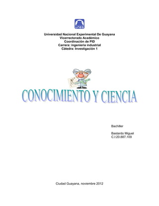 Este documento discute diferentes tipos de conocimiento, incluyendo el conocimiento científico, el conocimiento común, el conocimiento vulgar y el conocimiento popular. Explica que el conocimiento científico se obtiene a través de métodos sistemáticos y replicables, mientras que el conocimiento común se basa más en la experiencia. También contrasta las diferencias entre el conocimiento individual y colectivo. Finalmente, concluye que el conocimiento se basa en la información que los humanos recogen a lo largo de sus vidas y que la ciencia es fundamental para ad