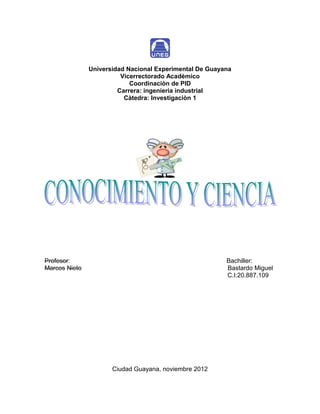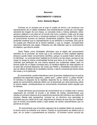 El documento resume los diferentes tipos de conocimiento, incluyendo el conocimiento vulgar adquirido a través de la experiencia cotidiana, el conocimiento científico sistemático obtenido a través de métodos establecidos, y el conocimiento popular. Explica las diferencias entre el conocimiento científico y el común, y discute cómo el conocimiento proviene tanto de procesos individuales como colectivos.