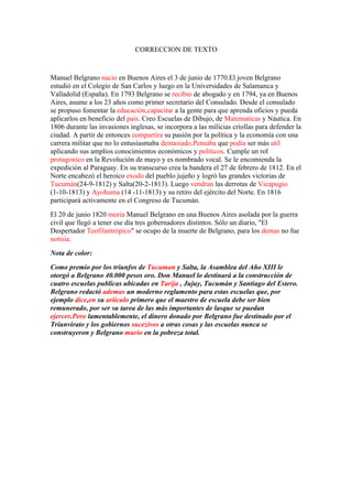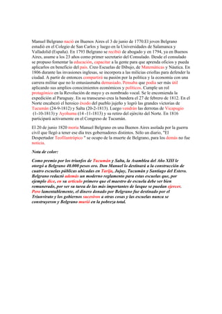 Manuel Belgrano nació en Buenos Aires en 1770 y se destacó como abogado, político, economista y militar durante la Revolución de Mayo y la guerra de independencia argentina. Creó la bandera argentina en 1812 y logró importantes victorias militares. Falleció en la pobreza en 1820 a pesar de haber donado fondos para la construcción de escuelas públicas.