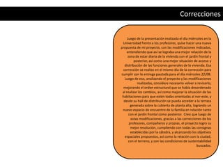 El documento presenta las correcciones realizadas a un proyecto de vivienda luego de recibir comentarios de profesores y compañeros. Se realizaron modificaciones a la relación de los ambientes con el jardín y la distribución interna. Luego de analizar las correcciones, el autor consideró necesario mejorar el orden estructural y la orientación de las habitaciones, logrando así una mejor resolución del proyecto que cumple con todos los requisitos.