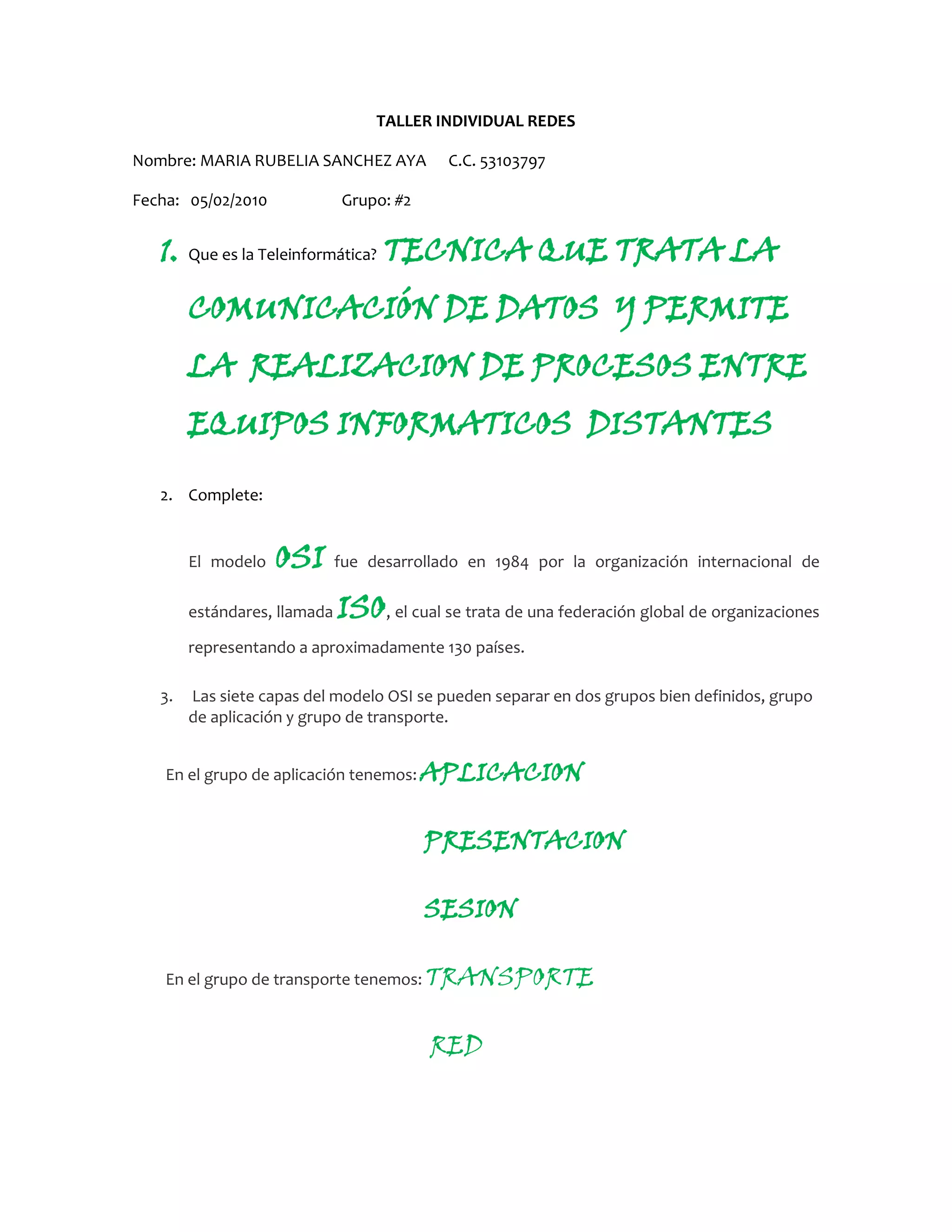 El documento habla sobre conceptos básicos de redes como la teleinformática, el modelo OSI, topologías de red, protocolos, clasificación de redes, servidores y sistemas operativos para servidores. Explica términos como IP, TCP, HTTP, SQL y define conceptos como LAN, MAN y WAN. También analiza cómo las tecnologías de comunicación han influido en la globalización y otros campos del conocimiento humano.
