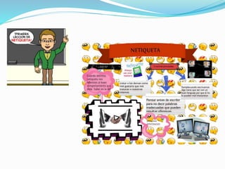 El documento ofrece consejos sobre la netiqueta correcta al comunicarse en línea, incluyendo saludar y despedirse cortésmente, usar mayúsculas, puntuación y tildes apropiadas para asegurar una buena interpretación del mensaje, y tildar siempre los verbos en tiempos pasados y futuros para evitar demoras.
