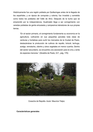 El documento resume la historia y características del corregimiento de Gualmatán en Colombia. Fundado en 1586, su economía gira en torno a la agricultura y ganadería, destacándose cultivos como repollo, brócoli y lechuga. Ubicado a 7 km de Pasto, tiene una temperatura de 10°C y limita con otros corregimientos. Su nombre en quechua significa corriente de agua que atraviesa la montaña.