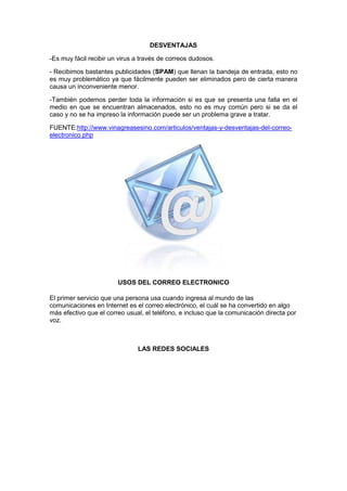El documento proporciona información sobre el correo electrónico, incluyendo sus ventajas como la inmediatez y bajo costo, y sus desventajas como la posibilidad de recibir virus. También discute los usos comunes del correo electrónico y introduce el tema de las redes sociales y la etiqueta en internet.