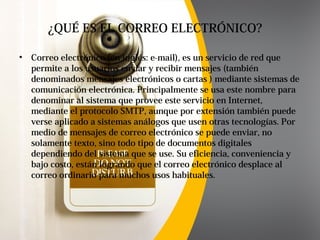 El documento compara el correo electrónico y el correo postal, describiendo sus similitudes y diferencias. Ambos permiten enviar mensajes de forma eficiente, pero el correo electrónico lo hace de forma gratuita e instantánea a través de Internet, mientras que el correo postal requiere el transporte físico de cartas de papel de un lugar a otro y el pago de tarifas.