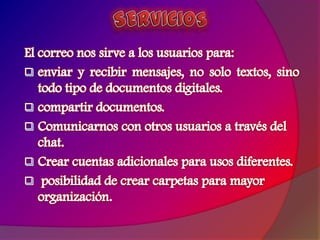 El correo electrónico o email es un servicio de red que permite enviar y recibir mensajes digitales de forma rápida y económica entre usuarios a través de servidores intermedios, de manera análoga al correo postal físico. Los usuarios pueden enviar todo tipo de archivos, comunicarse a través de chats, organizar contactos y bloquear correos no deseados.