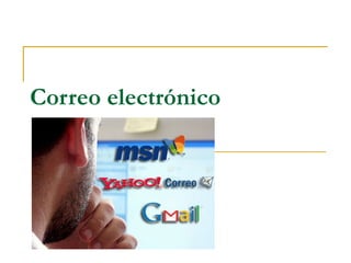 El correo electrónico permite a los usuarios enviar y recibir mensajes rápidamente a través de sistemas electrónicos. Se originó antes de Internet y fue una herramienta crucial para su creación. Para enviar correo, una persona necesita una dirección de correo electrónico proporcionada por un proveedor de correo. Los principales proveedores de correo electrónico gratuito son Gmail, Hotmail y Yahoo, los cuales ofrecen servicios de webmail.