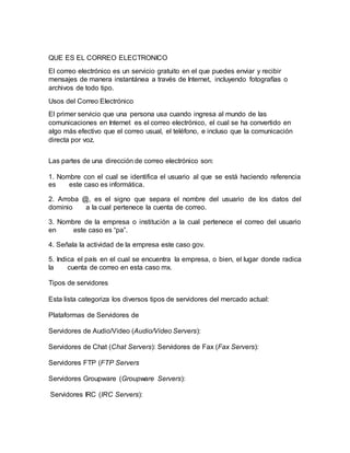 El correo electrónico permite enviar y recibir mensajes de manera instantánea a través de Internet, incluyendo archivos. Se ha convertido en una forma más efectiva de comunicación que el correo tradicional o el teléfono. El correo electrónico ofrece ventajas como bajo costo, velocidad, comodidad y la capacidad de enviar archivos, pero también tiene desventajas como la necesidad de acceso a Internet y el riesgo de virus o correo no deseado.