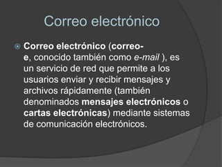 Este documento describe el correo electrónico, incluyendo su origen en la década de 1960, los elementos clave de una dirección de correo como el nombre de usuario y dominio separados por un símbolo @, y los principales proveedores de correo gratuito y de pago. También discute las ventajas del correo electrónico como su bajo costo y capacidad de enviar archivos, y las desventajas como la necesidad de un dispositivo electrónico y la amenaza de virus.
