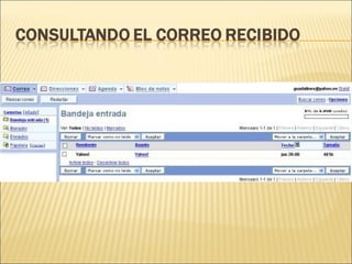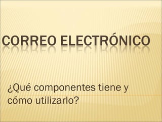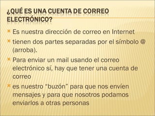 Este documento describe los componentes y usos del correo electrónico. Explica que una dirección de correo electrónico tiene dos partes separadas por el símbolo @, y que se necesita una cuenta de correo para enviar y recibir mensajes. También compara el correo web y POP, resumiendo sus ventajas y desventajas. Por último, explica cómo usar la libreta de direcciones para agregar y enviar correos a contactos individuales o listas de distribución.