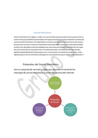 El correo electrónico es un servicio de red que permite el envío y recepción de mensajes electrónicos a través de sistemas de comunicación electrónica e Internet usando protocolos como SMTP, POP3 e IMAP. El correo electrónico tiene una estructura estándar que incluye el remitente, destinatario, asunto y mensaje, y permite adjuntar archivos digitales.