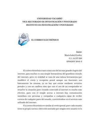 El documento describe el correo electrónico, incluyendo su historia, características, y cómo funciona. Un correo electrónico es similar al correo postal tradicional pero se envía electrónicamente a través de Internet. Cada usuario tiene una dirección de correo electrónico única asociada con su cuenta. Los mensajes se envían y reciben a través de servidores de correo operados por empresas como Google, Yahoo y Microsoft. El correo electrónico se ha convertido en el servicio más utilizado en Internet debido a su rapidez, bajo costo y conveniencia
