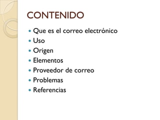 El documento habla sobre el correo electrónico. Explica que es un servicio que permite enviar mensajes y archivos rápidamente mediante sistemas electrónicos. Señala que su uso principal es enviar texto y documentos digitales de forma eficiente y a bajo costo. Además, describe que el correo electrónico surgió en 1965 y para 1966 se había extendido rápidamente a través de redes de computadoras.