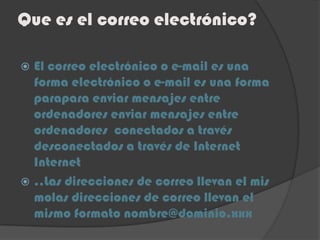 El correo electrónico permite enviar mensajes entre ordenadores conectados a Internet. Se necesita una dirección de correo en formato nombre@dominio que identifique al remitente. Los mensajes se envían a través de servidores de correo electrónico usando protocolos como SMTP y pueden ser leídos a través de clientes de correo o en la web.