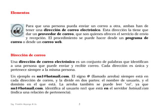 El correo electrónico es un servicio que permite enviar y recibir mensajes a través de Internet. Fue creado en 1971 por Ray Tomlinson y utiliza direcciones de correo compuestas por un nombre de usuario y un dominio separados por el símbolo @. Los usuarios necesitan registrarse con un proveedor de correo para poder enviar y recibir mensajes. El correo electrónico se ha convertido en una importante herramienta de comunicación, aunque plantea problemas como el spam y los virus informáticos.