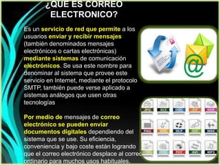 El documento describe el correo electrónico, incluyendo su origen en los años 1960, su evolución con la incorporación del símbolo @ por Ray Tomlinson en 1971, y sus elementos básicos como remitente, destinatario y mensaje. Explica que se necesita una dirección de correo y un proveedor para enviar y recibir correos, mencionando problemas comunes como el correo no deseado y los virus, así como servicios gratuitos populares.