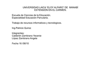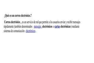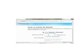 Este documento proporciona información sobre los servicios de correo electrónico de Gmail y Hotmail. Explica las funciones de un servidor de correo y cómo crear una cuenta de Gmail, la cual ofrece mucho espacio de almacenamiento gratuito y menos spam. También describe cómo leer, enviar y adjuntar archivos a correos electrónicos en Hotmail, incluyendo los pasos para ingresar a la cuenta, rellenar los campos del correo y enviarlo.
