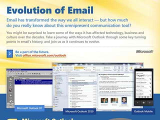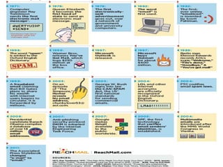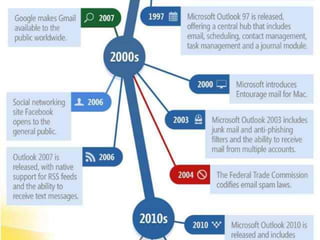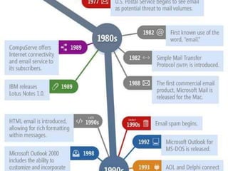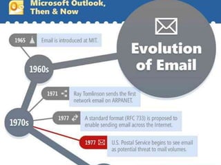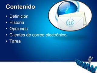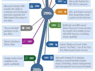 El documento proporciona información sobre el correo electrónico. Explica que el correo electrónico permite a los usuarios enviar y recibir mensajes rápidamente a través de Internet usando el protocolo SMTP. Brevemente describe la historia del correo electrónico, desde sus orígenes en los años 1960 hasta la incorporación del uso de la arroba por Ray Tomlinson en 1971. Finalmente, resume los dos tipos principales de cuentas de correo electrónico, correo web y correo POP, e identifica algunos proveedores populares como Hotmail, Gmail y Yahoo