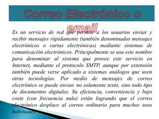 El correo electrónico permite enviar y recibir mensajes de forma rápida a través de sistemas de comunicación electrónicos usando el protocolo SMTP. Se puede enviar texto y documentos digitales de forma eficiente y a bajo costo. Un correo electrónico necesita una cuenta con un nombre de usuario y un dominio para funcionar, permitiendo la comunicación entre usuarios a través de servidores de correo.