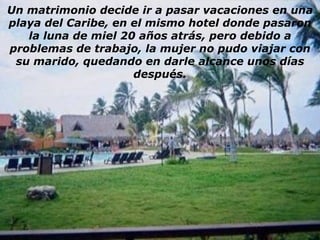 Un hombre envió un correo electrónico a su esposa desde el hotel donde pasaron su luna de miel 20 años atrás, pero se equivocó en una letra del correo y lo envió a otra persona por error. La persona que recibió el correo equivocado era una viuda que acababa de llegar del funeral de su marido, y se desmayó al leer el correo pensando que era de su fallecido esposo.