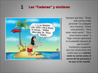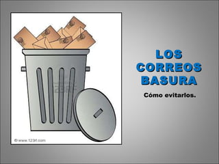 Este documento ofrece consejos para evitar el correo basura ("spam"), incluyendo no reenviar cadenas de correo que prometen suerte o amenazan con mala suerte, y no responder a correos que piden reenviarlos o firmar peticiones. También recomienda devolver el correo basura a las compañías que lo envían para hacerlas pagar el costo del envío y desanimarlas de continuar enviando correo no deseado.