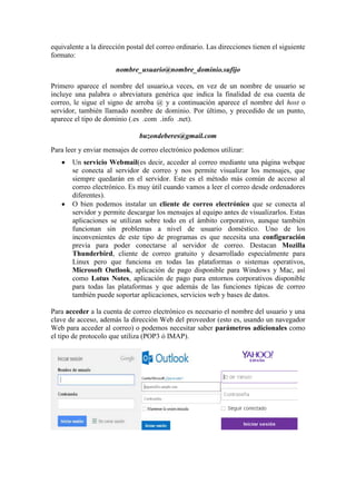 El correo electrónico permite el intercambio de mensajes y archivos digitales entre computadoras a través de protocolos como SMTP. Los mensajes electrónicos viajan entre servidores de correo hasta llegar al destinatario y se almacenan en su buzón electrónico. El proceso involucra un emisor, receptor, servidores de correo entrante y saliente, y las direcciones de correo electrónico tienen el formato nombre_usuario@dominio.