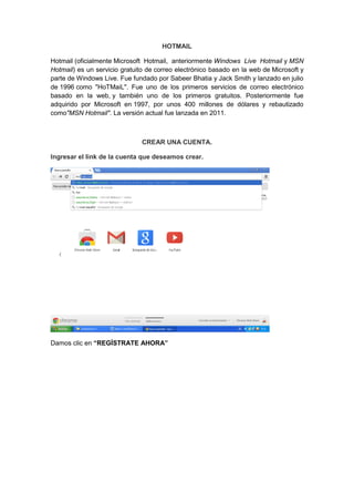 Este documento proporciona un resumen de tres oraciones del portafolio de Leonardo Ramírez Arias, un estudiante del cuarto año de hotelera y turismo en la Universidad Técnica de Machala. El portafolio incluye información sobre los servicios de correo electrónico Hotmail, Gmail y Yahoo, así como cómo crear y personalizar cuentas en cada uno. También explica cómo usar funciones como filtros, temas, respuestas automáticas y etiquetas en los diferentes servicios de correo electrónico.