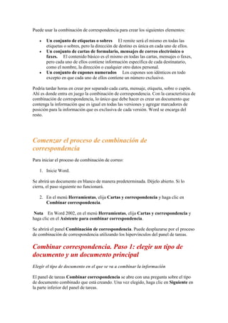 Este documento presenta los pasos para combinar correspondencia en Word. Estos incluyen: 1) elegir un tipo de documento y documento principal, 2) conectarse a un archivo de datos y seleccionar registros, 3) agregar campos al documento principal, y 4) obtener una vista previa y completar la combinación. La combinación de correspondencia permite crear versiones personalizadas de un documento al combinarlo con información exclusiva de cada registro en un archivo de datos.