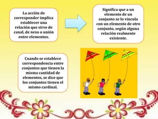 La correspondencia implica establecer una relación entre elementos de conjuntos. Existen diferentes tipos de correspondencia como la unívoca que vincula un elemento de un conjunto con uno del otro, la biunívoca que permite relacionar elementos de forma reversible entre dos conjuntos, y la múltiple que establece equivalencias entre tres o más conjuntos.