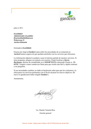 El documento contiene cartas idénticas enviadas por Garden's a varios clientes en diferentes países. En las cartas, Garden's agradece a los clientes por elegirlos, asegura su satisfacción con los servicios, ofrece información adjunta, y detalles de contacto contable en caso de preguntas. También indica que evaluarán cambios en necesidades para ofrecer nuevos servicios.