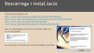 Este documento proporciona instrucciones para descargar e instalar Thunderbird, configurar una cuenta de correo electrónico, personalizar la apariencia y funcionalidad de Thunderbird mediante la instalación de temas, complementos, filtros y etiquetas, y gestionar el correo electrónico mediante la creación de carpetas, lista de contactos y eliminación de correo no deseado.