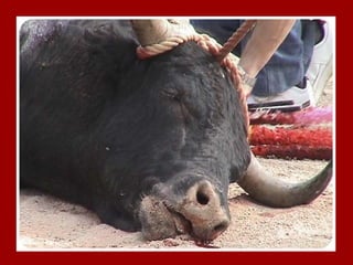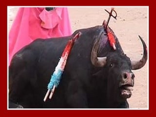 El documento describe la crueldad y el sufrimiento que experimentan los toros en las corridas de toros. Se detalla cómo los toros son maltratados y debilitados antes de entrar en la arena, y cómo son torturados durante la corrida a través de la lanza del picador, las banderillas y finalmente la espada, lo que les causa un sufrimiento agonizante. El documento pide al lector que no sea indiferente al dolor de los toros y que rechace esta tradición que denigra a los seres humanos.