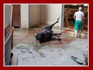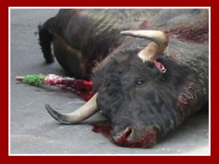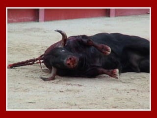 El documento describe la crueldad y el sufrimiento que experimentan los toros en las corridas de toros. Se detalla cómo los toros son maltratados y debilitados antes de entrar en la arena, y cómo son torturados durante la corrida a través de la lanza del picador, las banderillas y finalmente la espada, lo que les causa un sufrimiento agonizante. El documento pide al lector que no sea indiferente al dolor de los toros y que rechace esta tradición que denigra a los seres humanos.