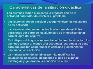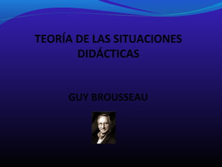 Este documento resume la teoría de las situaciones didácticas desarrollada por el matemático francés Guy Brousseau. Explica que la teoría busca crear condiciones para la construcción artificial del conocimiento matemático a través de situaciones de aprendizaje. Define las situaciones didácticas, a-didácticas, de acción, formulación, validación e institucionalización. También describe el contrato didáctico y efectos como Topaze y Jourdain. El objetivo es comprender mejor los procesos de enseñ
