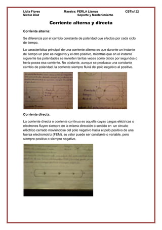 El documento describe las diferencias entre corriente alterna y directa. La corriente alterna cambia constantemente de polaridad en cada ciclo, mientras que la corriente directa fluye siempre en la misma dirección desde el polo negativo al positivo.