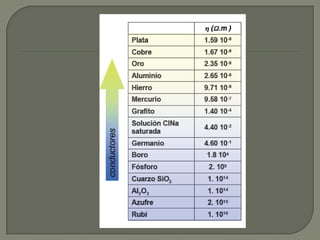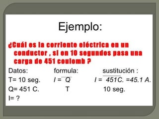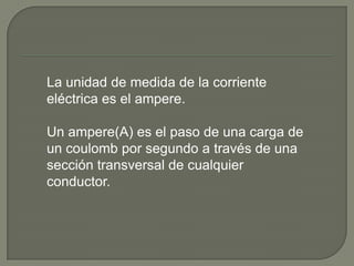 La corriente eléctrica es el flujo de electrones por un material y se mide como la carga eléctrica que pasa a través de una sección en un tiempo dado. Para que haya corriente eléctrica se necesita una fuente de fuerza electromotriz, un conductor, y una carga o resistencia conectada al circuito. Existen dos tipos de corriente: directa, donde los electrones fluyen en una sola dirección, y alterna, donde cambian periódicamente de dirección.
