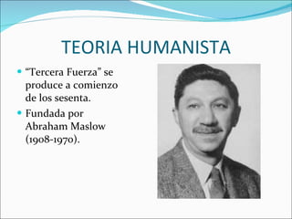 La teoría humanista de la "Tercera Fuerza" surgió en la década de 1960 fundada por Abraham Maslow como protesta a las escuelas psicológicas dominantes de la época que se enfocaban en la enfermedad y deficiencia en lugar de estudiar a las personas sanas. La teoría propone que el ser humano es bueno por naturaleza y que el desarrollo saludable se logra a través de la autorrealización o tendencia innata a desarrollar todo nuestro potencial. Si bien ha sido criticada por ser v