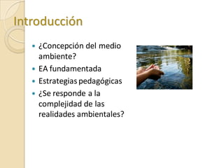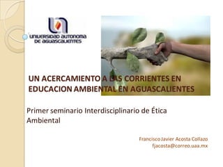 Este documento resume las principales corrientes de educación ambiental que se han desarrollado en Aguascalientes, México. Incluye una tabla comparativa que describe las intenciones, concepciones del medio ambiente, estrategias pedagógicas y autores clave de las corrientes naturalista, activista, formal, moral/ética, científica y de sostenibilidad. El documento concluye que aunque existen diferencias entre las corrientes, también comparten similitudes y pueden complementarse para responder mejor a la complejidad de los problemas ambientales.