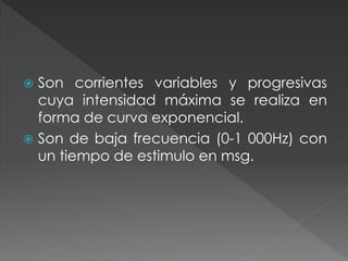 Este documento describe diferentes tipos de corrientes eléctricas, incluyendo corrientes variables y progresivas cuya intensidad máxima se realiza en forma de curva exponencial, y corrientes exponenciales que circulan en forma de pulsos de diferentes formas de onda. También discute el uso de electrodos para aplicar estimulación eléctrica a músculos lesionados y nervios en regeneración, e indica varias condiciones médicas donde la estimulación eléctrica puede ser útil, como lesiones nerviosas, parálisis facial, at
