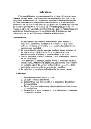 1) El documento presenta información sobre el materialismo, incluyendo sus características y postulados principales. También describe a filósofos representantes de esta corriente como Carlos Marx, Friedrich Engels, Ludwig Feuerbach. 2) Se resumen brevemente las biografías de estos tres filósofos representantes del materialismo. 3) Finalmente, el documento ofrece una definición breve del idealismo como corriente filosófica opuesta al materialismo.
